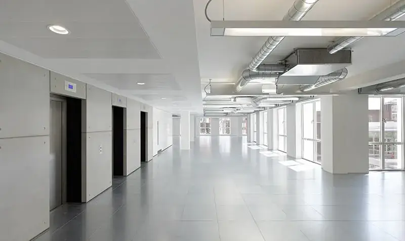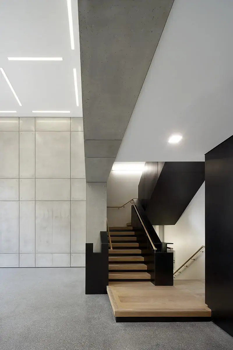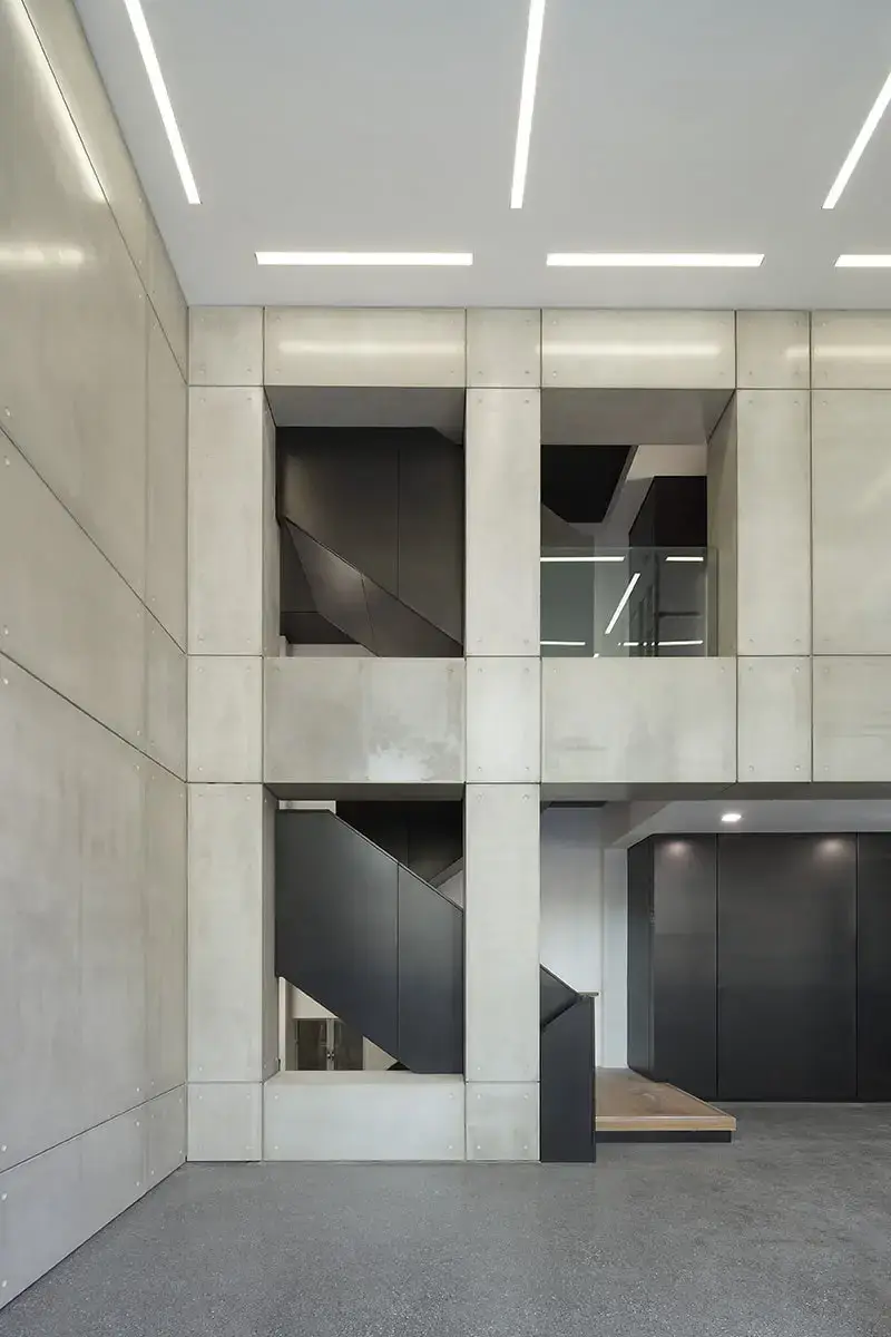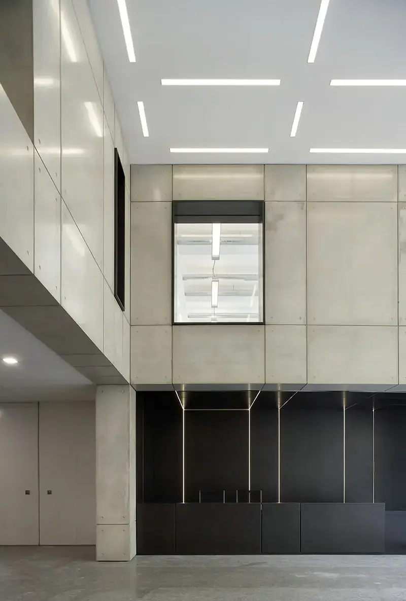 25a Soho Square provides 45,000 sq ft of contemporary office space. There is an impressive entrance with a double height reception area that has been fully clad in MASS Concrete smooth sanded wall panels. Lift lobbies and a back entrance portico are clad in the same bespoke finish with circular depressions that mimic site poured concrete.