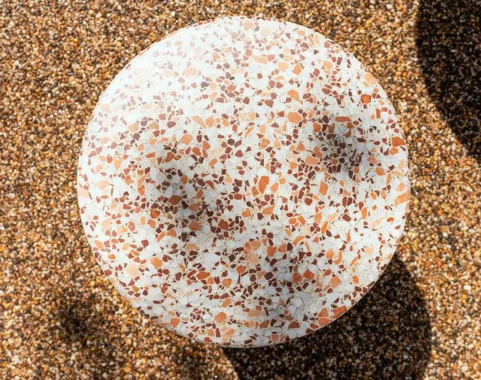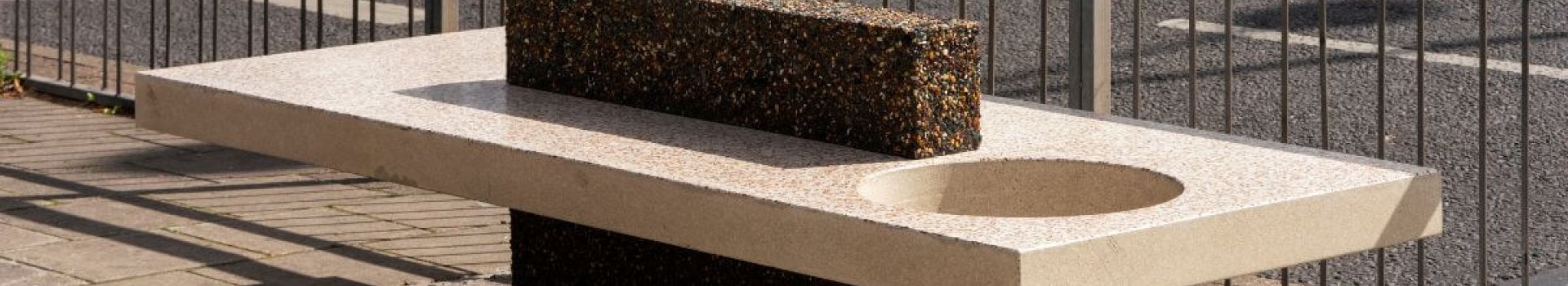 Both concrete finishes use a hand selected combination of aggregates to compliment the surrounding areas, with smooth polished terrazzo style tops with a contrasting retarded finish for the vertical units.