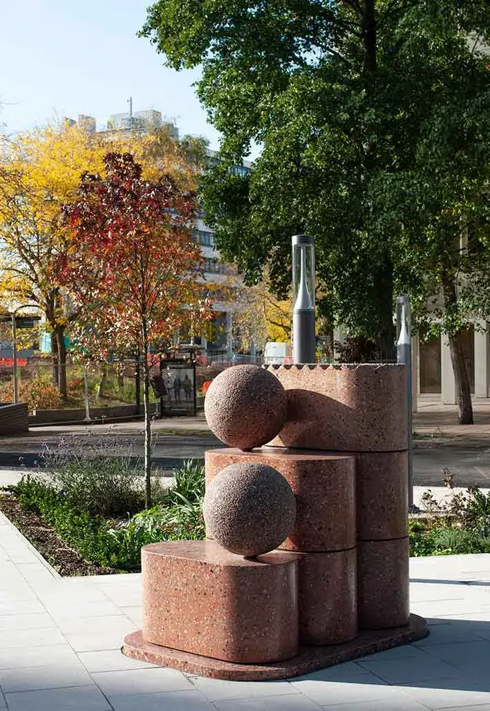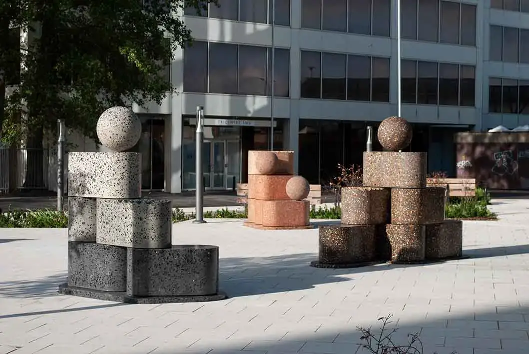 The human-scaled sculptures offer a lovely injection of colour and character into the surrounding area while celebrating the beauty of recycled materials and end of life potential to be crushed and re-used as an aggregate many years from now.