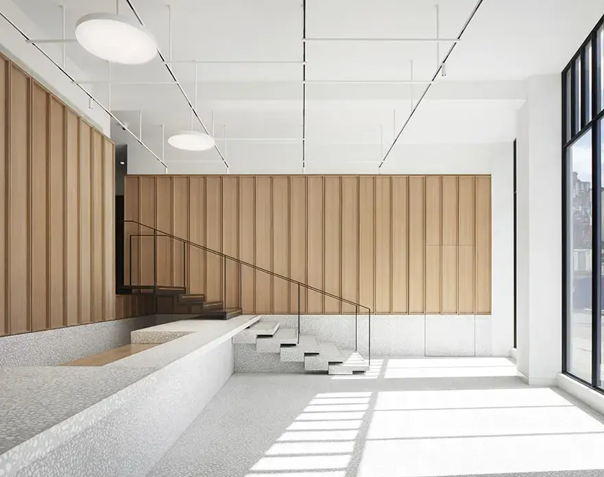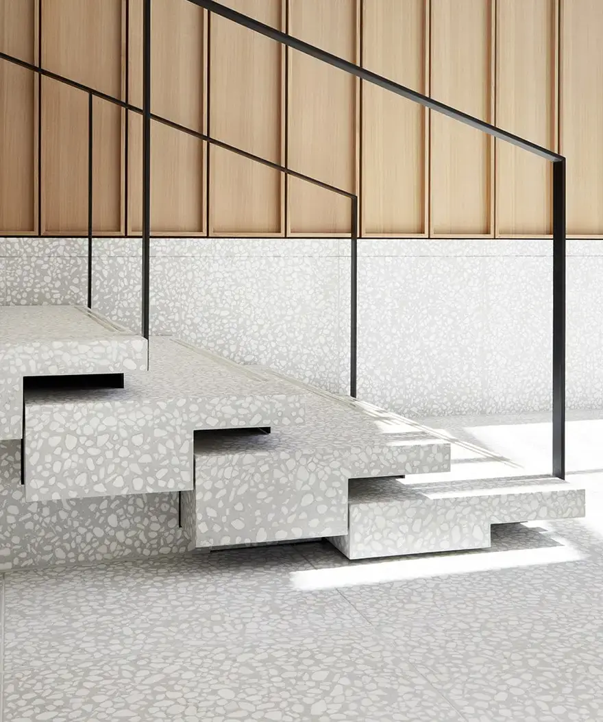 In 2017 Piercy and Co approached MASS Concrete to explore concept finishes. Fast forward to the tail end of 2019, and a main contract managed by BW, MASS Concrete manufactured stair treads, floor and wall panels, all using an imported sparkling White marble from a specific Greek island, to this stunning feature terrazzo-feel reception space.