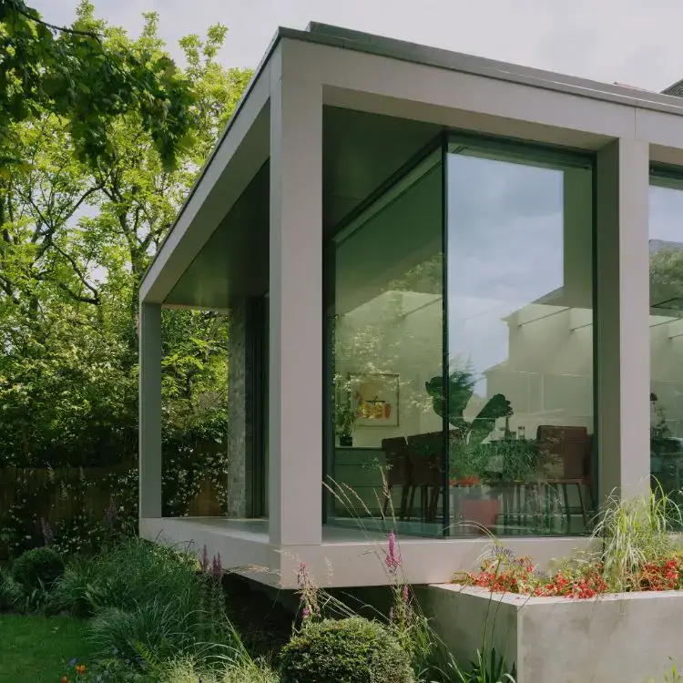 Oakhill Avenue is a gorgeous residential project featuring tailor-made external concrete wall panelling developed in collaboration with the architects at Studio Farshi/Carver. MASS Concrete manufactured and installed the panelling to create a beautiful bespoke planter and colonnade that encircles the new glass extension on the property. This eye-catching extension showcases a concrete mix featuring dolomite sand that creates a stunning shimmery finish on the product, enhanced by the natural light in the garden.